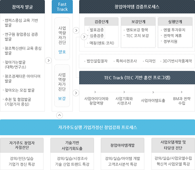 아래와 같은 자기주도실행 기업가정신 창업강좌 프로세스를 거친 후에 다시 Fast Track을 진단하는 과정을가지게 됩니다.